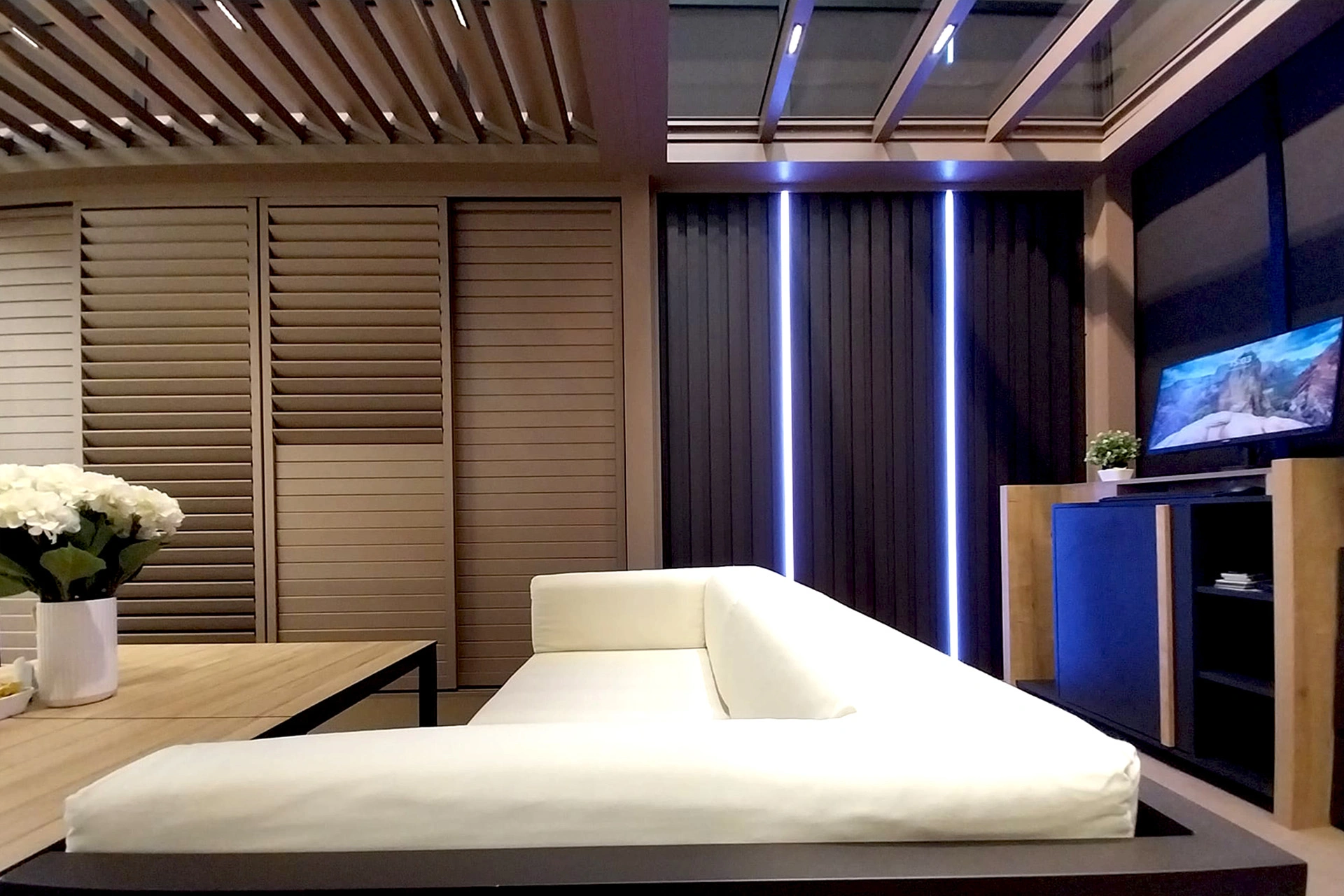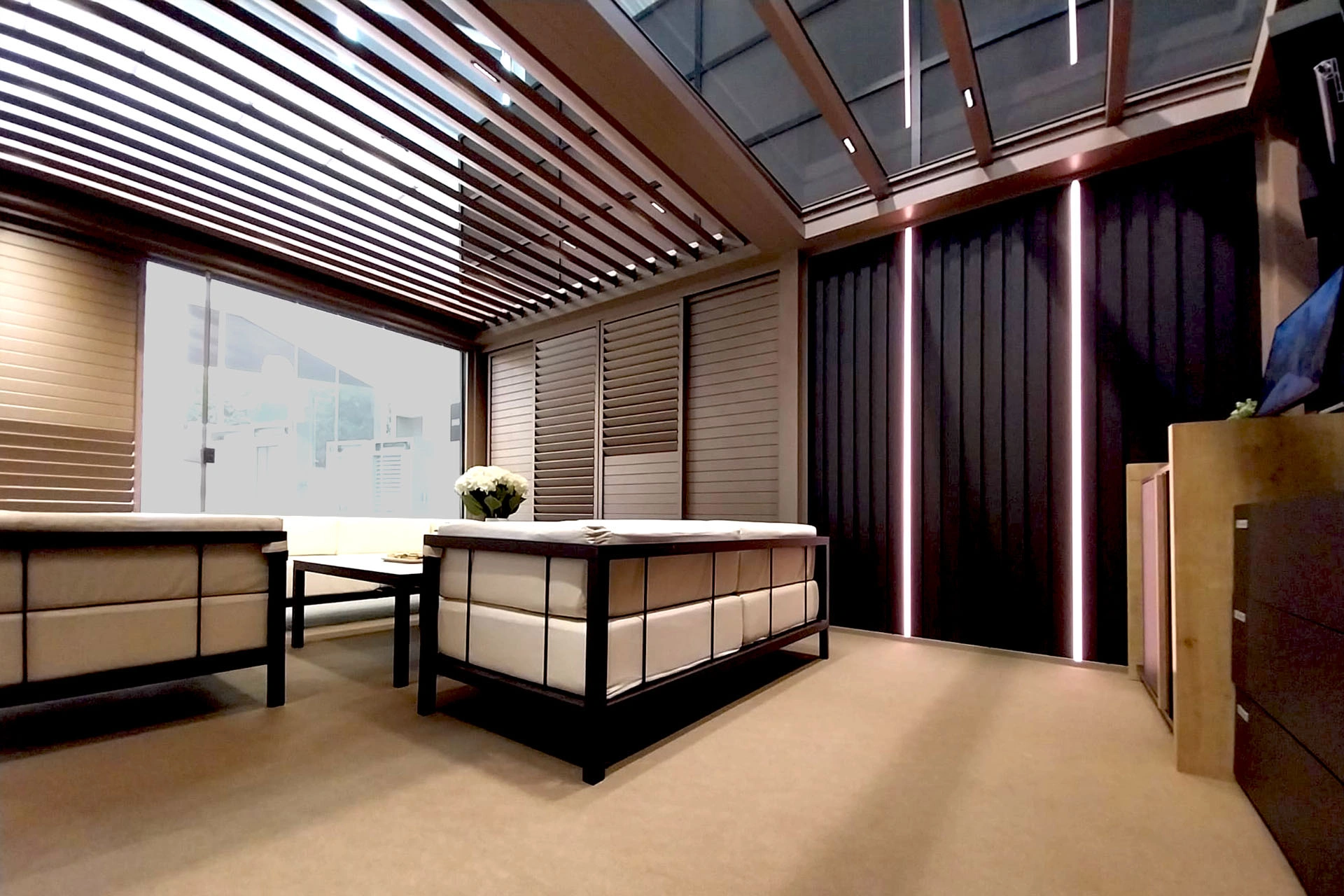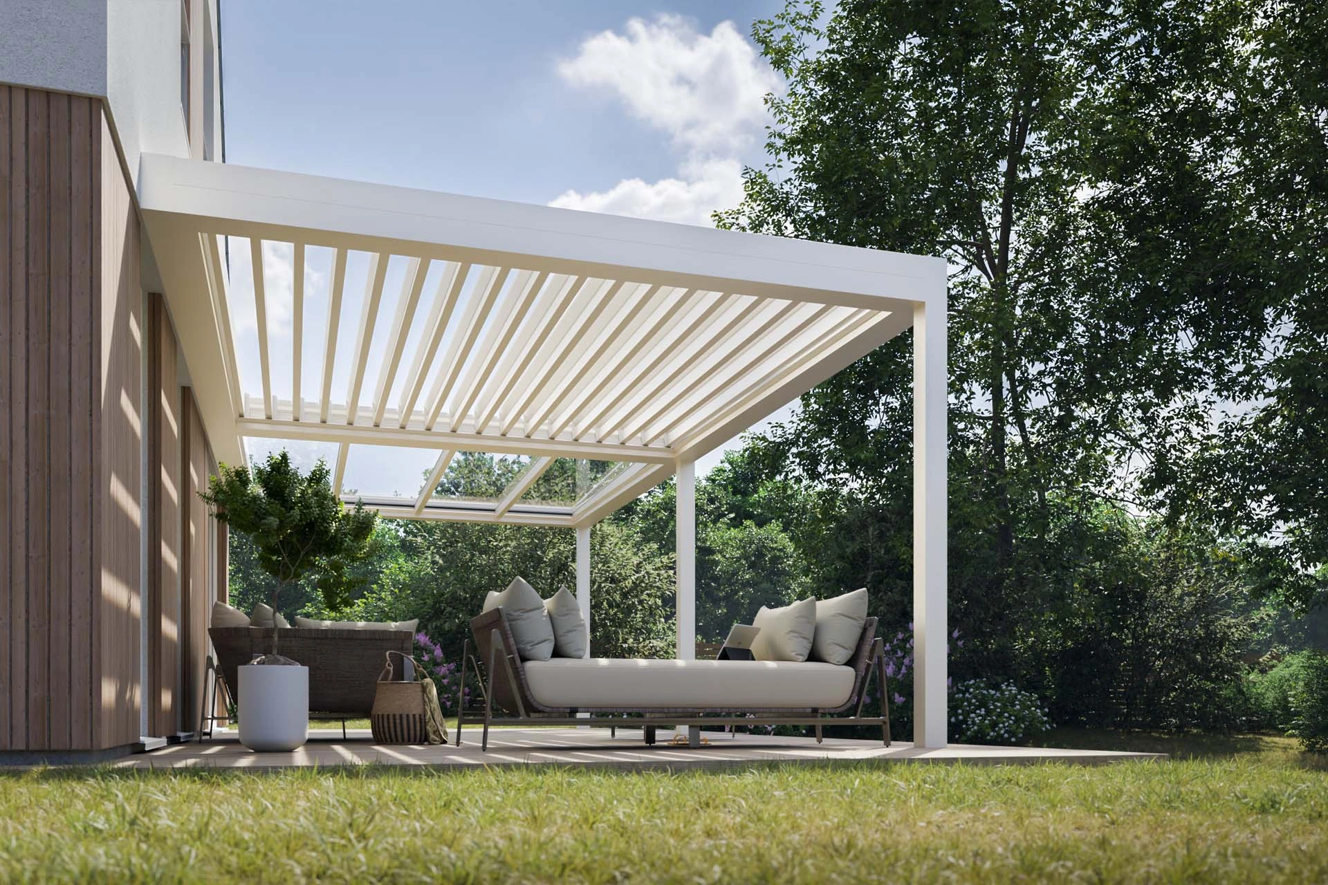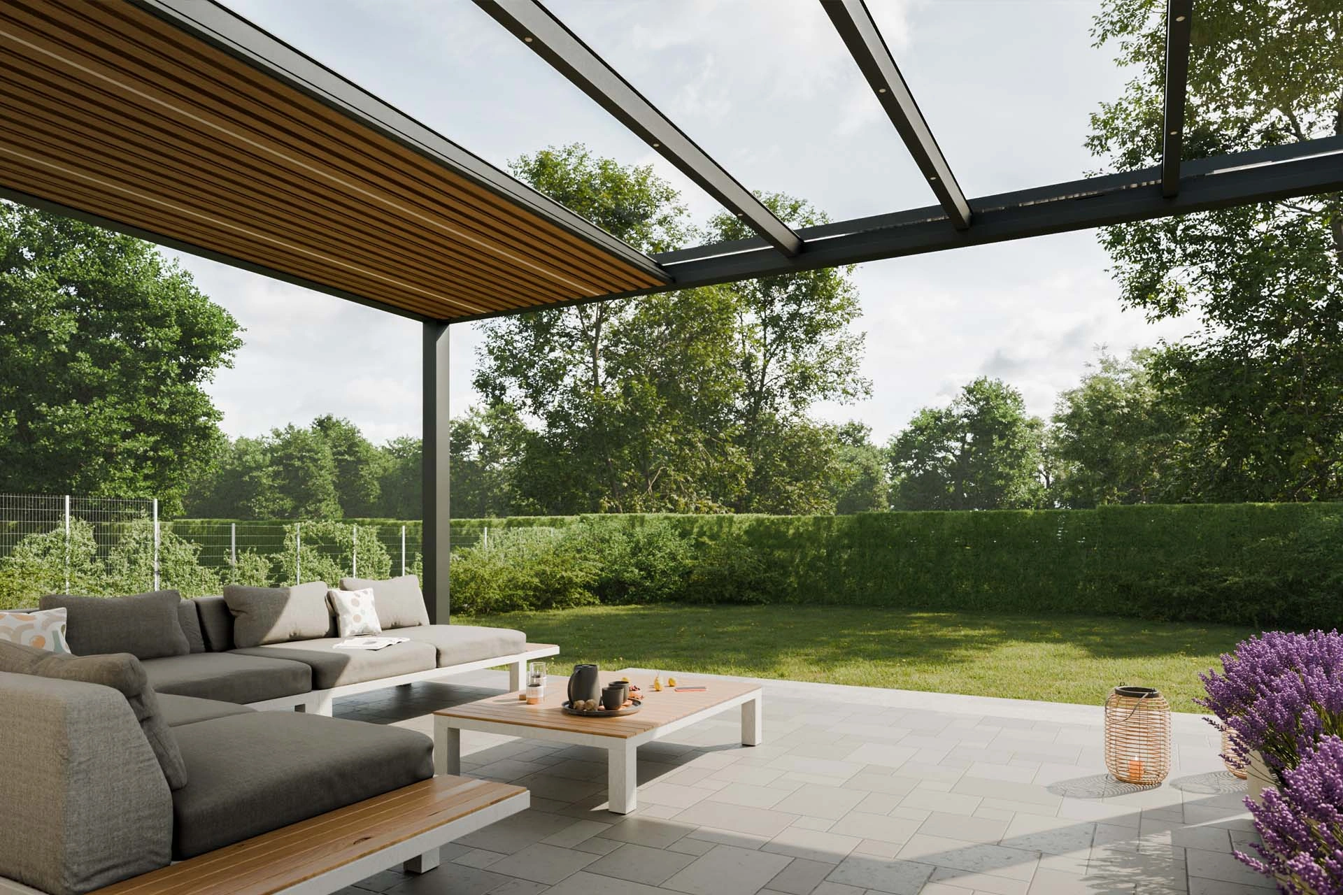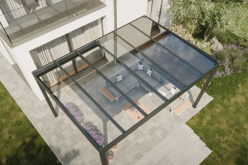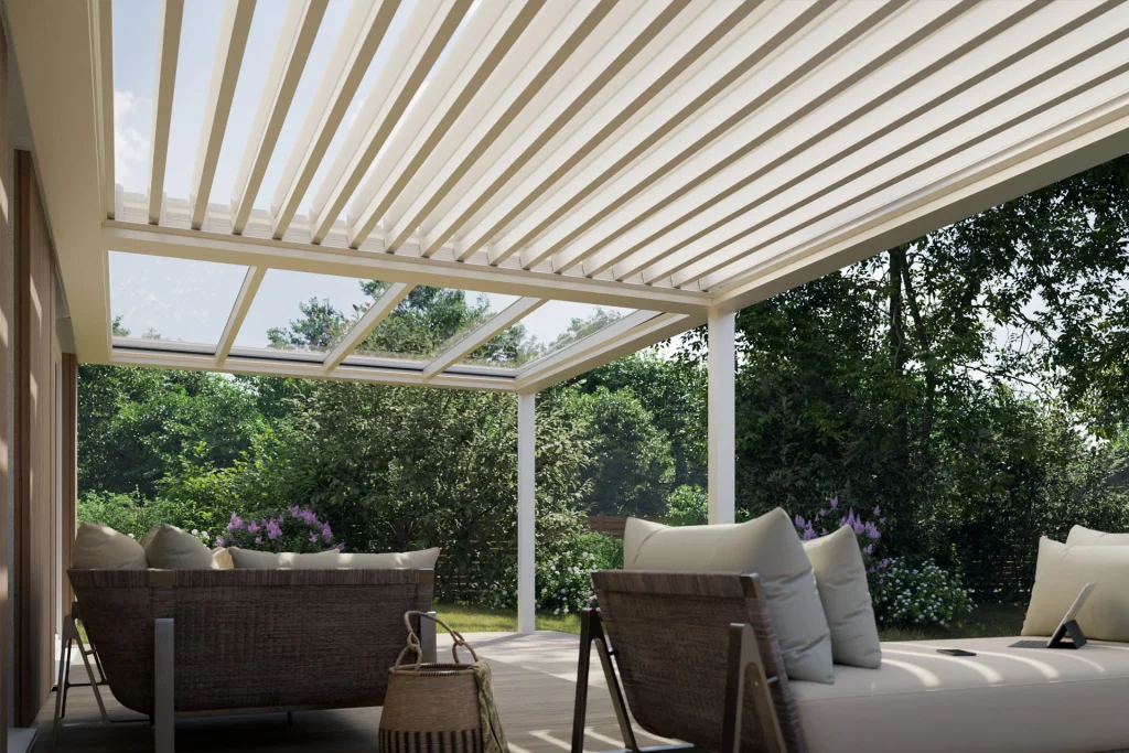 Lamelna streha omogoča nastavljivo prezračevanje in zaščito pred soncem, medtem ko steklena streha prepušča obilico naravne svetlobe. Ta hibridni strešni sistem se prilagaja vremenskim razmeram in vašim potrebam ter zagotavlja prijetno bivanje skozi ves dan.