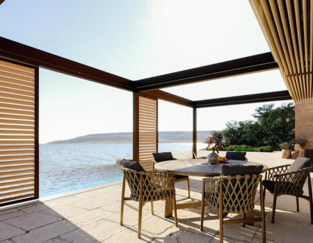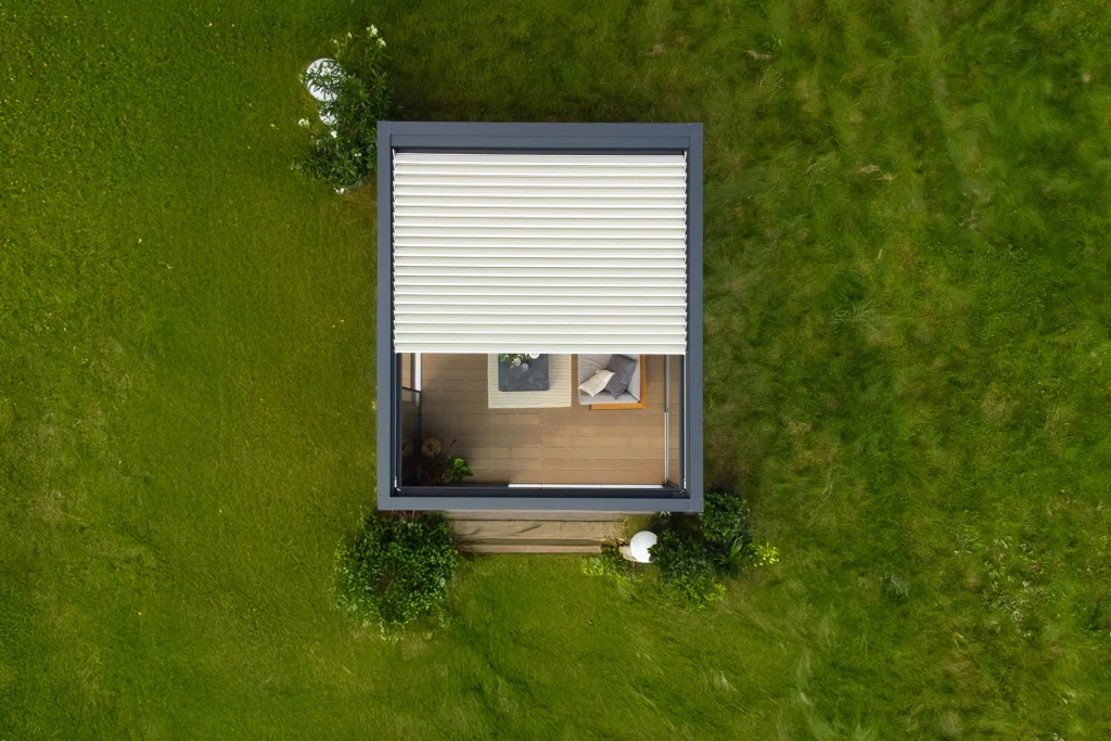Posebna zasnova omogoča vgradnjo tako steklenih drsnih sten kot rolo senčil brez potrebe po dodatnih kasetah, kar pergoli daje izjemno prefinjen in moderen izgled.